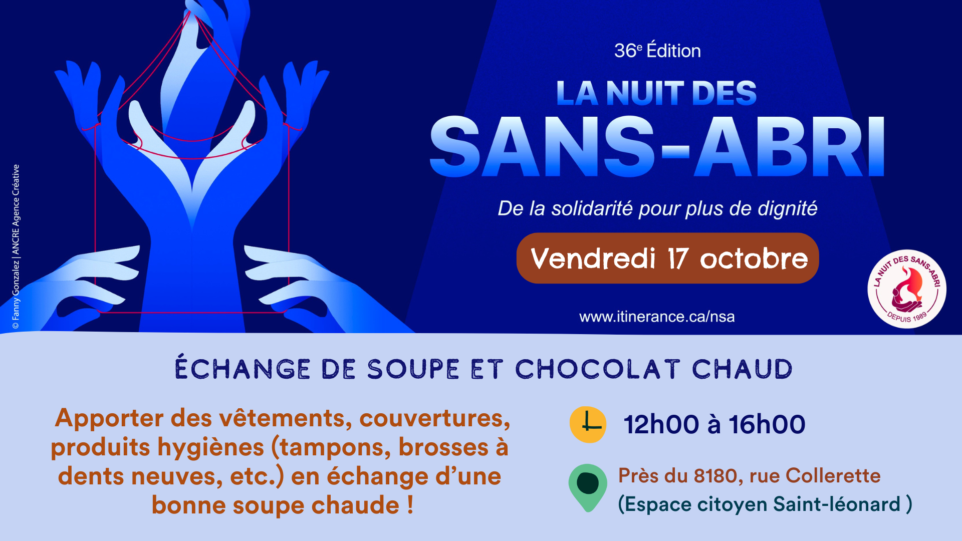 Le 17 octobre, de 12 h à 16 h, retrouvons-nous à l’Espace citoyen de Saint-Léonard pour la Nuit des sans-abri. Ensemble, faisons un geste de solidarité envers les personnes en situation d’itinérance.