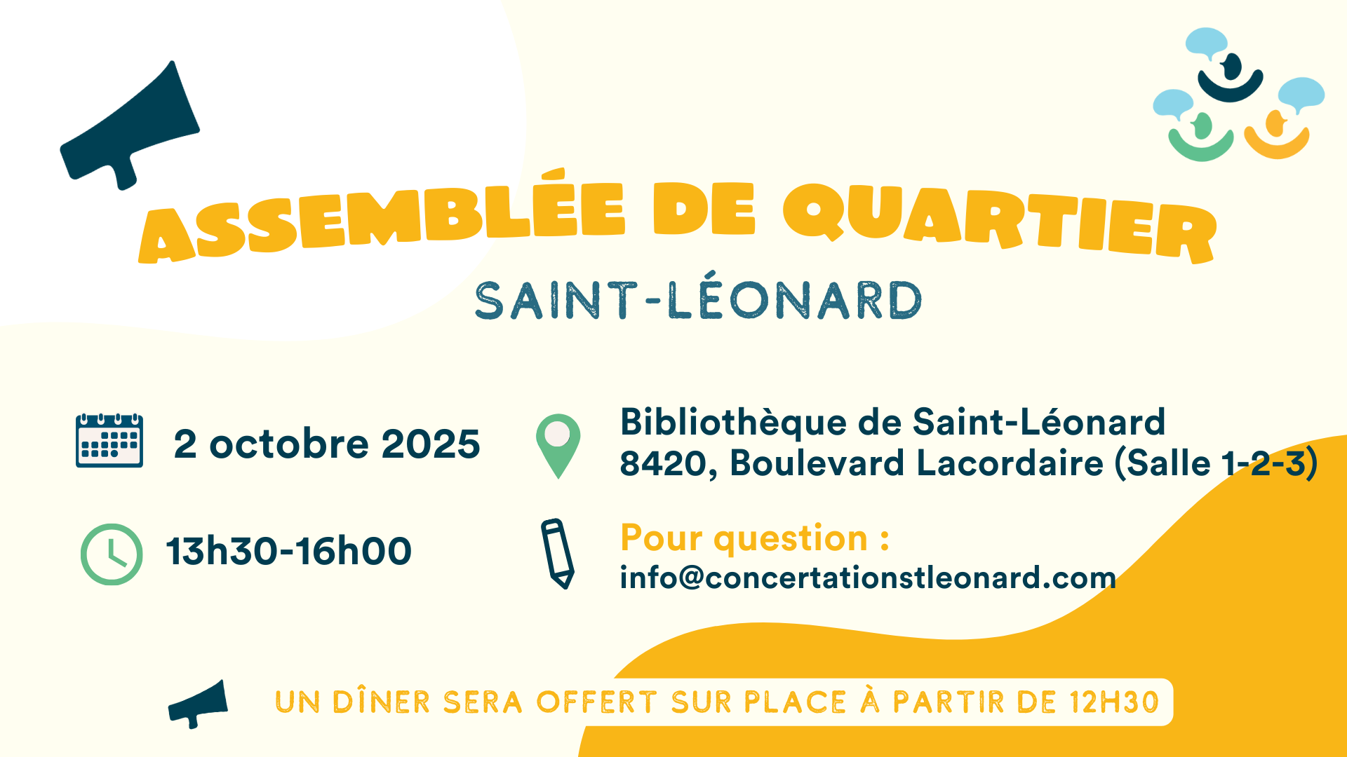 Un dîner festif fera suite à l’Assemblée de quartier de la rentrée et se déroulera à l’Espace citoyen de Saint-Léonard de 12h15 à 14h. Il vise à célébrer la rentrée de la concertation et le lancement de la Léo Van de Saint-Léonard.